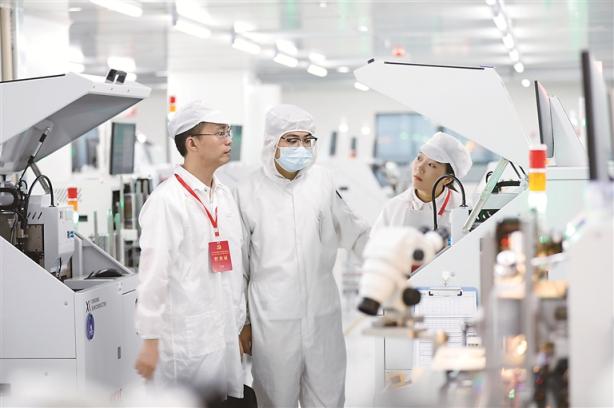 四川省南充市顺庆区纪委监委聚焦党中央关于发展新质生产力的重大决策部署,紧盯惠企政策落实等重点环节加强政治监督。图为该区纪检监察干部(左一、右一)在一家企业的智能制造基地了解政策落地等情况。黎涛 摄